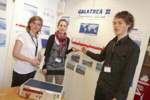 - Tina Robenhaven van der Bijl, Louise Gardsted Juhl og Asbjørn Mathiasen viser 2u fra Silkeborgs Gymnasiums projekt Baggrundsstråling målt på Galathea 3. Foto ved fotograf Ole Mortensen/Tilsted Com.