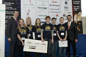 - Frederik Juel Ladefoged, Jacob Benjamin Møller Sørensen, Linette Hammerich Østergaard, Mathilde Rahek, Sofie Jaquet Sørensen og Søren Riis Christiansen fra Rostrup Skole ved Arden får overrakt deres 3. præmie af H.K.H. Prins Joachim og videnskabsminister Helge Sander. Foto ved fotograf Søren Palmelund/Tilsted Com.
